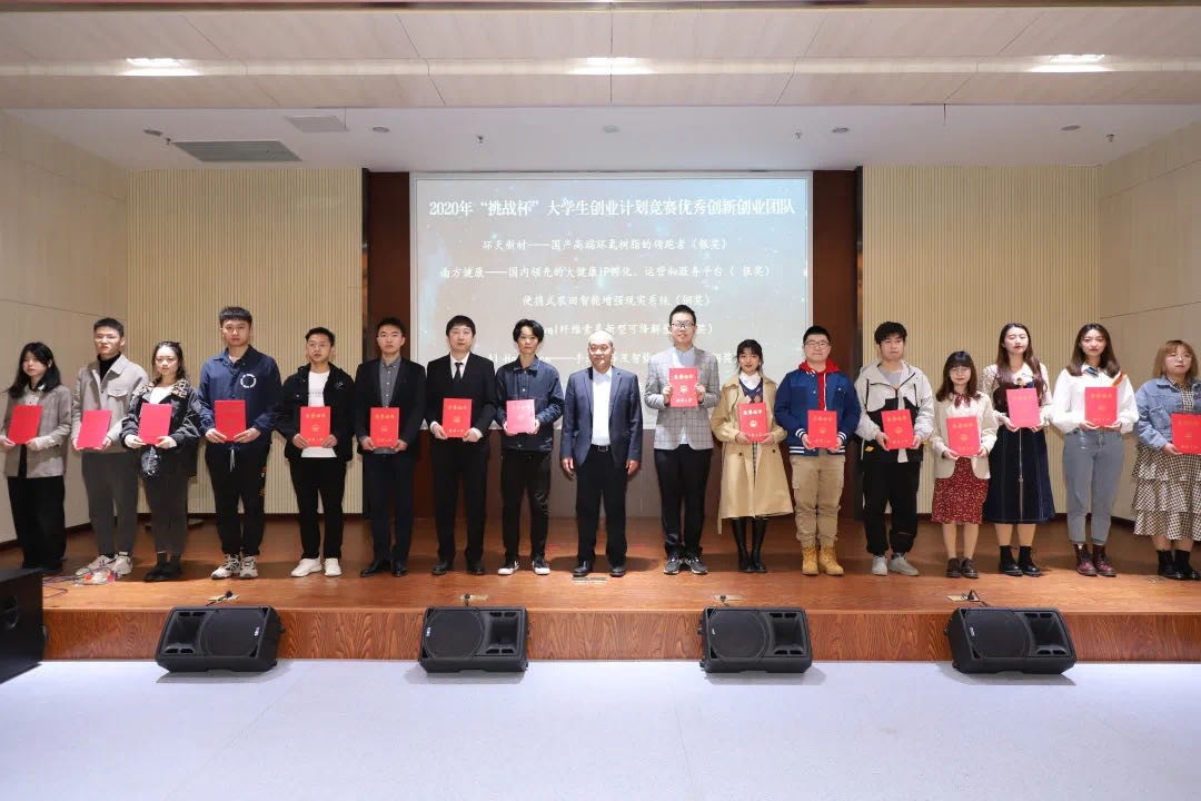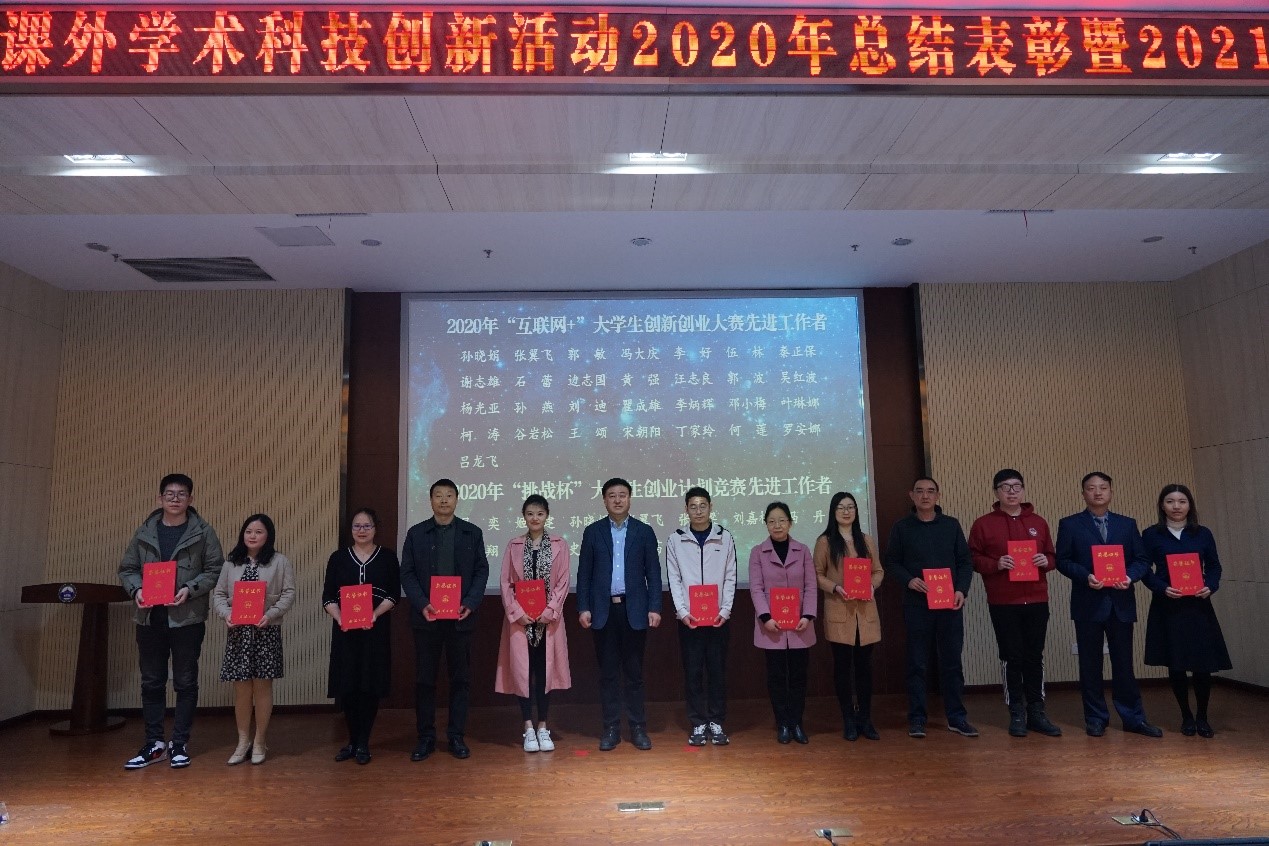 2020学生课外学术科技创新活动先进集体”荣誉称号,“环天新材—国产高端环氧树脂的领跑者”团队荣获“优秀创新创业团队”称号,黄驰、蔡杰、常春雨、廖俊荣获“优秀指导老师”称号,吴奕、姬建建荣获“先进工作者”称号。