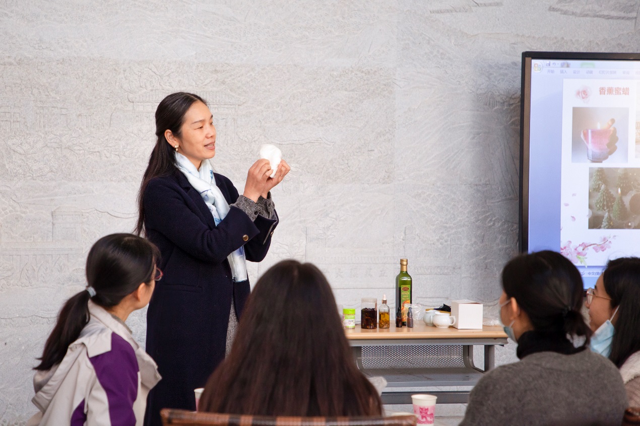 讲座中,培训老师详细地为大家讲解了蜜蜡的类型、精油的制作方法、基本使用范围,以及色彩、香氛搭配等知识,并细致地为大家示范了制作香薰蜜蜡的步骤。
