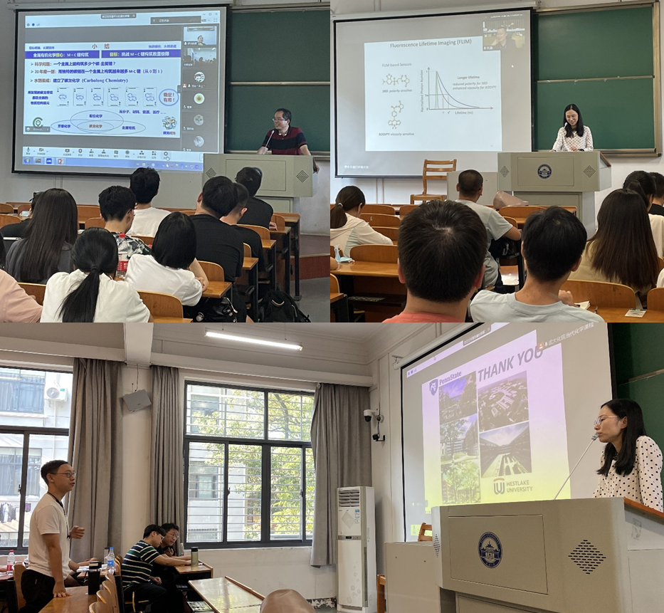 9月5日和12日的两次课中,南方科技大学夏海平教授、西湖大学张鑫教授应邀授课,共同为化院师生分享了他们在科研领域的探索以及最新进展。第一次课,夏海平教授主要介绍了在《碳龙化学-共轭碳链与过渡金属组成的全新芳香体系》研究方面的工作,其团队发现一系列稳定的由碳链螯合过渡金属的Craig物种和聚合物,以及据此建立的富有特色的“碳龙化学(Carbolong Chemistry)”。碳龙配合物和聚碳龙因金属直接嵌在全共轭稠环骨架内,金属的d轨道参与共轭,其性能与传统有机、高分子共轭体系有明显区别,在太阳能利用、小分子活化、催化、锂-氧电池、高分子材料修复、生物医学等领域具有良好的应用前景。第二次课,张鑫教授介绍了蛋白质聚集的复杂变化过程以及如何区分蛋白质聚集的不同状态。临床上,阿尔兹海默症、帕金森症等多种神经退行性疾病的产生与蛋白质聚集密切相关。其中错误折叠的变性蛋白会首先形成液态多聚体,随后进一步发展成为固态聚集体,其团队通过分子设计调节粘性和极性来实现对蛋白质聚集不同状态的区分,并发展了一系列面向活细胞内蛋白质聚集和蛋白内稳态的定量成像新技术,解决了蛋白质聚集相关的重要问题,理解了小分子药物对蛋白质聚集和蛋白内稳态的作用,为重大疾病的诊断和治疗提供了新的思路。两位教授的报告逻辑清晰,内容丰富,讲解深入浅出,为同学们带来很多启发。随后,李振教授、李倩倩教授与夏海平教授、张鑫教授就科学发展、人才培养等方面亦进行了深入的交流。通过前两次的授课,可以发掘出当代化学课程很强的前瞻性和指导性,该课程着眼于学生的终身可持续发展,真正做到以学生为本,发挥了其最大的价值!