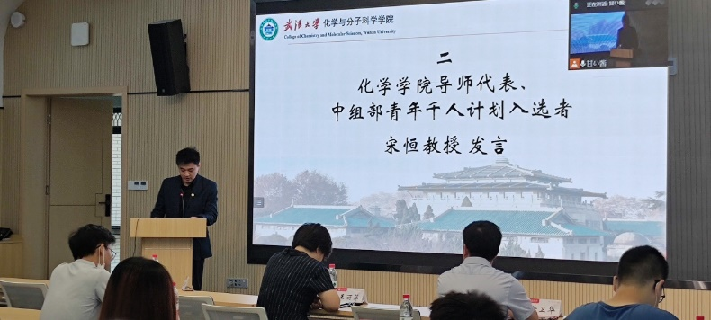 紧接着,新生见面会的第二项,导师代表,中部组宋恒教授发言。他提出研究生应该具有创新思维,跳出常规思维舒适区,保持个性和独立性,作为研究生的新鲜血液,大家具有天马行空的想象力,应该多和导师互相交流,丰富自己理论经验的同时,和老师交流自己具有创新性的想法。