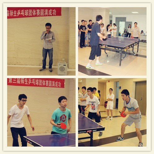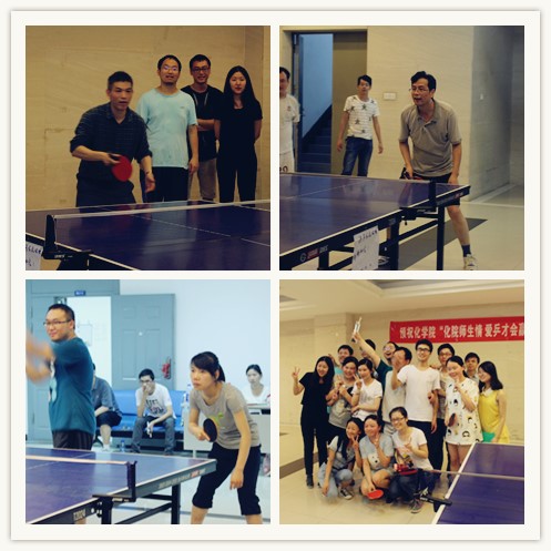 5月17日上午8点15,倍受化院人期待的“化院师生情,爱乒才会赢”第三届师生乒乓球团体赛在化西二楼乒乓球台拉开了序幕。本次乒乓球赛共有10个实验室或实验室联队参加,分别进行混双、男双、女双、男单及女单等项目的角逐。经过一天的预赛、半决赛和决赛,胡斌教授队荣膺桂冠,刘义教授、艾新平教授联队获得亚军,冯钰琦教授队及杨楚罗教授、龚少龙教授、谢国华教授联队获得比赛的并列第三名。