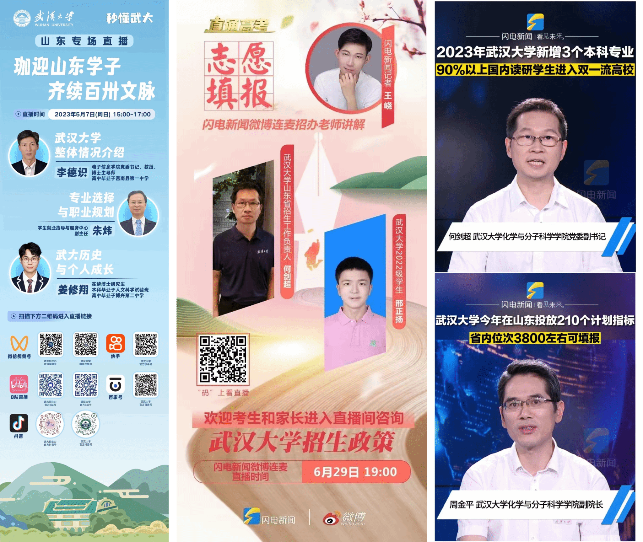 山东招生咨询QQ群,组织专任教师、学生大使在群内对招生政策、学校概况、专业特色、办学条件等问题与群里考生及家长进行交流答疑,获得了考生及家长的好评。招生组还通过“秒懂武大”山东专场、山东广播电视台“直通高考”、闪电新闻微博连麦等线上平台开展宣传工作,并与考生及家长交流互动,参与人次超过10万,取得了良好的宣传效果。在做好线上宣传的同时,招生组从2023年3月起,先后7次前往济南、青岛、日照、威海、滨州、淄博等地区开展前期招生宣传工作,发放招生宣传材料5000余份,为后续的招生攻坚战打下了坚实的基础。集中宣传期间,招生组奔赴山东省16个地市区开展集中宣传和志愿填报指导活动120余场,收集符合学校招生目标位次段的考生700余人,并在现场宣传后开展针对性电话或线上回访,与考生和家长保持密切联系,指导服务报考。