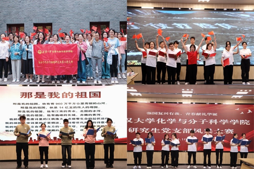 各研究生党支部选择了多种多样的展示形式,充分展现了爱国主义情怀与新时代研究生党员的责任担当。其中,分析化学研究生第六党支部采用合唱《如愿》并朗诵《青年新语》,深情表达了对祖国的真挚祝福;无机化学研究生第一党支部通过PPT展示结合朗诵,表达对祖国的美好祝愿;分析化学研究生第四党支部围绕“强国有我”主题朗诵,深深激发爱国之情;高分子化学与物理研究生第三党支部与应用化学研究生党支部联合,以“青春逐梦,向光而行”为主题合唱,展现追梦青春。
