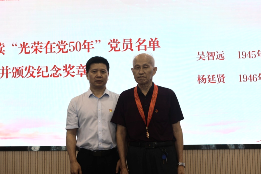 共有2名老党员吴智远、杨廷贤获得“光荣在党50年”荣誉称号,院党委书记黄卫华为参会老党员杨廷贤佩戴纪念章并合影留念。五十年栉风沐雨,五十年初心如磐,他们以半生的坚守诠释了共产党人的初心与使命。党的百年辉煌,离不开老党员们的无私付出与默默耕耘,他们既是党和国家的宝贵财富,也是化院砥砺前行的精神灯塔。“光荣在党50年”荣誉称号承载了历史与希望,青年党员应以老党员同志为榜样,从历史中汲取奋进力量,赓续红色血脉。