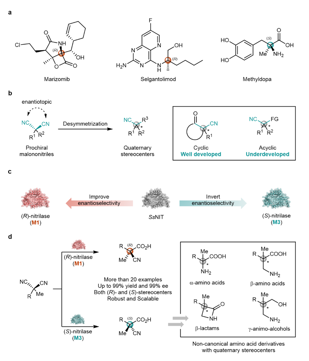 季碳手性中心作为许多药物分子和天然产物的关键结构单元,其引入可显著提升分子饱和度、增加三维复杂性,影响化合物的药理活性。季碳手性中心的构建一直是合成化学领域的研究热点和难点。传统化学催化方法不仅依赖昂贵的过渡金属催化剂,还面临反应条件苛刻、对映选择性难以控制等问题。而酶催化方法凭借高特异性、温和反应条件及环境相容性等优势,逐渐成为解决复杂手性合成难题的重要途径。然而,酶催化构建全碳季碳手性中心的方法仍然有待发展。