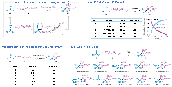 本工作中,研究团队发展了以丙二腈与叠氮二羧酸酯为反应对的MAAD生物正交反应。该反应无需额外催化剂和添加剂,在室温、水溶液及生理条件下即可快速、定量进行,在宽pH范围、离子强度及谷胱甘肽、蛋白等复杂背景下仍保持高选择性和高转化率,底物易于合成和改造,展现出优异的生物兼容性和通用性。