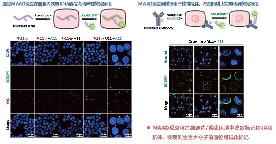 依托这一新正交反应,研究团队构建了多种应用场景:其一,利用带丙二腈手柄的2'-OH 修饰试剂,实现RNA骨架的可控化学标记,再通过MAAD反应“一步点击”连接生物素或荧光基团,用于体外RNA富集和活细胞RNA成像;其二,将丙二腈模块引入蛋白和抗体,结合MAAD反应实现蛋白及细胞膜受体的特异性标记和荧光示踪,为抗体探针和膜蛋白成像提供了新策略。