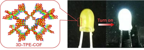 汪成课题组的最新研究成果。该工作合成了具有黄色荧光的三维共价有机框架(COF),首次制备了基于COF的白色发光二极管,拓展了此类材料的新应用。