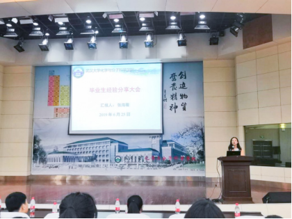 为了帮助化院学子熟悉招聘流程,清晰自己的职业规划以及发展方向,6月25日下午两点半,化学色情直播于创隆厅成功举办了2019届毕业生经验分享交流会。出席此次大会的有色情直播研究生辅导员朱紫薇和研究生兼职辅导员孙嘉瑾,110多位2020届毕业研究生参加了此次大会。本次分享交流会邀请到毕业生代表分别是姚倩、郑思洁、朱鹏程、丁聪、喻丽莎、徐娟、张海薇七位同学,这七位同学来自不同的专业,有硕士和博士,涉及到国外博后、高校、事业单位、国企、三资企业等不同的发展方向,他们向同学们分享了自己在规划未来、选择岗位、面试准备等方面的经验。
