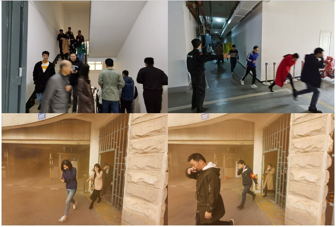下午3点,演习正式开始。保卫部工作人员在化西楼大厅及车库点燃演习专用发烟弹,浓烟触发报警器,消防控制室确认“火警”后,迅速控制电梯停用,启动西楼防火卷帘门和消防广播,发布消防警报。警报响起后,各楼层师生按照演习预案,立即寻找最近的安全通道疏散撤离至楼外的集结点。整个疏散过程历时6分钟,共计319人疏散撤离。