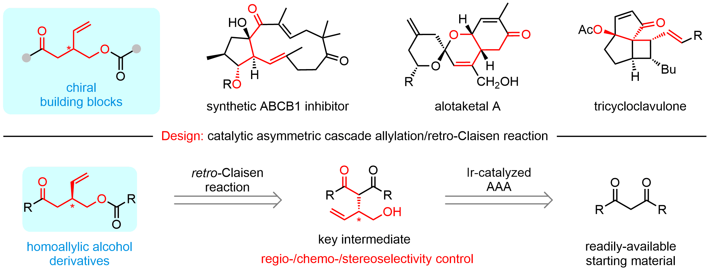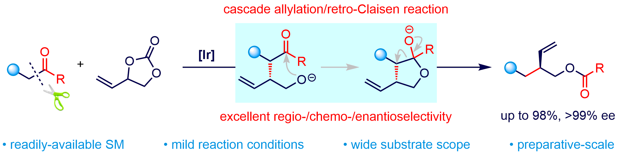 该团队以商品化、价廉易得的β-二酮和环状乙烯基碳酸酯(VEC)为原料,通过巧妙设计成功开发了铱催化不对称串联烯丙基化/Retro-Claisen反应,以良好的产率和优异的对映选择性顺利实现一系列多官能团化的手性3-羟甲基戊烯衍生物(高达98%产率,>99% ee),该合成策略还能适用于一系列β-位上含有不同吸电子官能团的酮类化合物,具有很好的官能团适用性和底物普适性。