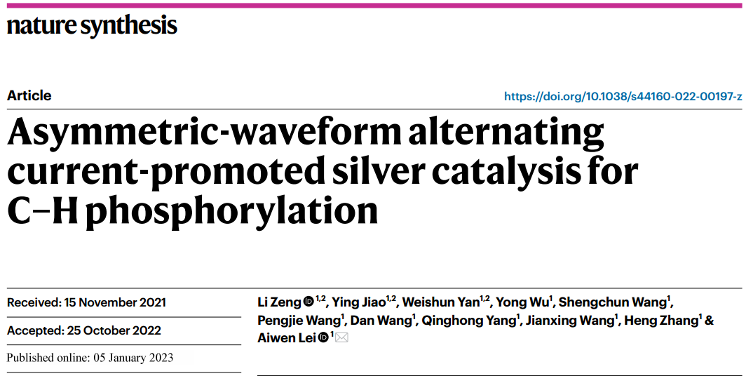 、高等研究院雷爱文教授团队在《自然•合成》(Nature Synthesis)上发表了一篇题为“Asymmetric-waveform alternating current-promoted silver catalysis for C–H phosphorylation”(不对称波形交流电促进银催化用于碳氢键膦酰基化反应)的研究成果。