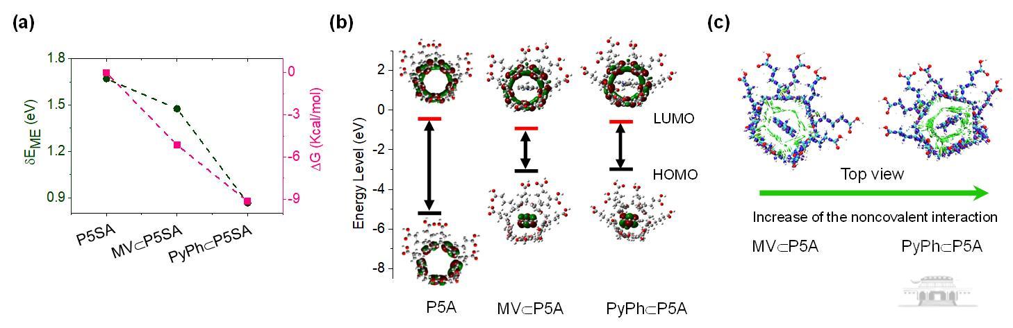 图3. (a)固相SAMs中分子-电极能级差(δEME)和溶液中主客体复合物吉布斯自由能 (ΔG)的趋势比较;(b) P5A、MVP5A和PyPheP5A 的HOMO-LUMO能隙 (B3LYP/6-31G (d, p));(c) MVP5A (左)和PyPheP5A (右)的非共价结合等值面图。