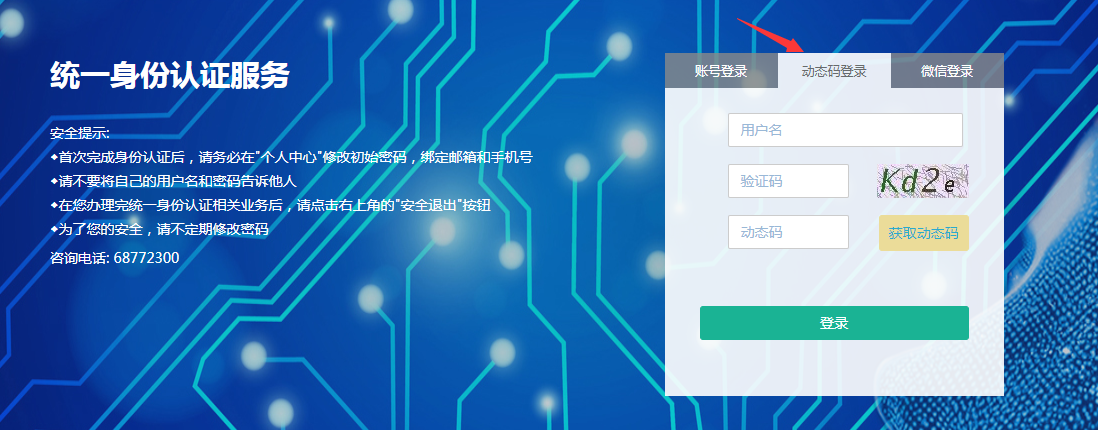 如老师派学生或助理来打印报销材料,在登录学校信息门户时候可以选择动态密码登录(第二种),这样只需要填写老师的工号之后系统会自动发送短信给老师,老师可以将短信验证码给办事人员,办事人员登录系统帮助老师打印相关报销材料。