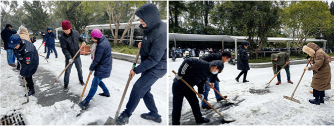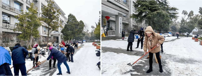 2月22日,新学期开学第一天,经一夜雪和霰,校园内银装素裹,却给出行带来不便。为保障师生出行安全,在色情直播领导带领下,机关办公室和物业合力清理色情直播东门和西门道路,大家不惧严寒风雪,干劲十足,铲雪除冰,暖心迎开学。