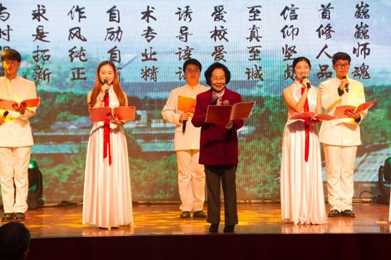带来的饱含深情的朗诵《师德铭》拉开了典礼的序幕,向所有导师们致以最崇高的敬意。在朗诵声中,张俐娜院士从舞台中央走出,深情地和同学一同诵读,并接受了她曾经的学生,现湖北葛店人福药用辅料有限公司总经理张阳洋的颁奖。张院士在领奖时表示:“在四十四年前来到武汉,我就决心将我的一生献给教育。我爱我的学生,也尊重我所遇到的老师、同学和朋友,因此我们的团队才能从无到有、从弱到强,这就是师生携手、共创辉煌的力量。”在谈及和学生的相处时,张院士说,自己和学生的关系就像朋友一样亲密,我关心学生,学生们也关心我。此外,她还谈及了对自己人生转折点和科研发展路上有着深刻影响的老师,感谢他们的教育和帮助,也决心像他们一样为学生更好的发展尽心尽力。
